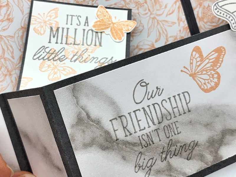 Today I’ve got another Wiper Fun Fold Card for you! This card has softer colors than the one I showed you a few days ago (see that card HERE) and it starts with the Peony Garden Designer Series Paper. Petal Pink and Grays. It reminds me of my grandma who had beautiful gray hair and always dressed in pink and gray!