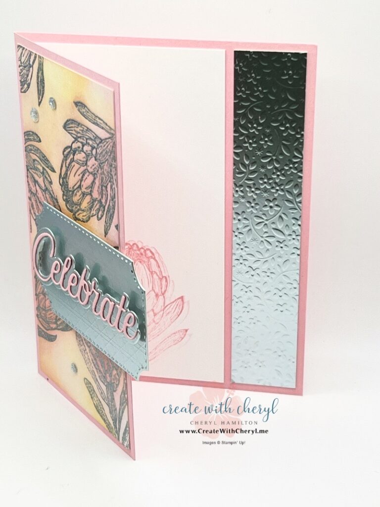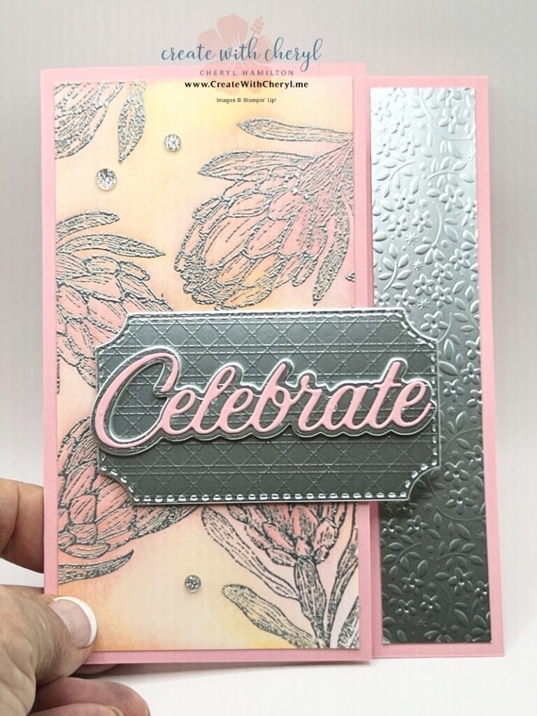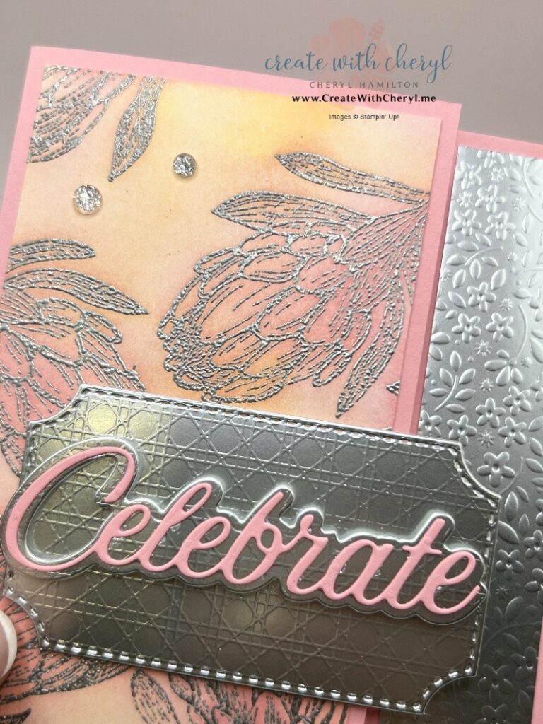 I needed to get some SILVER onto this card! I started out by heat embossing the protea in silver, and adding a bit of Flower Garden Foils.