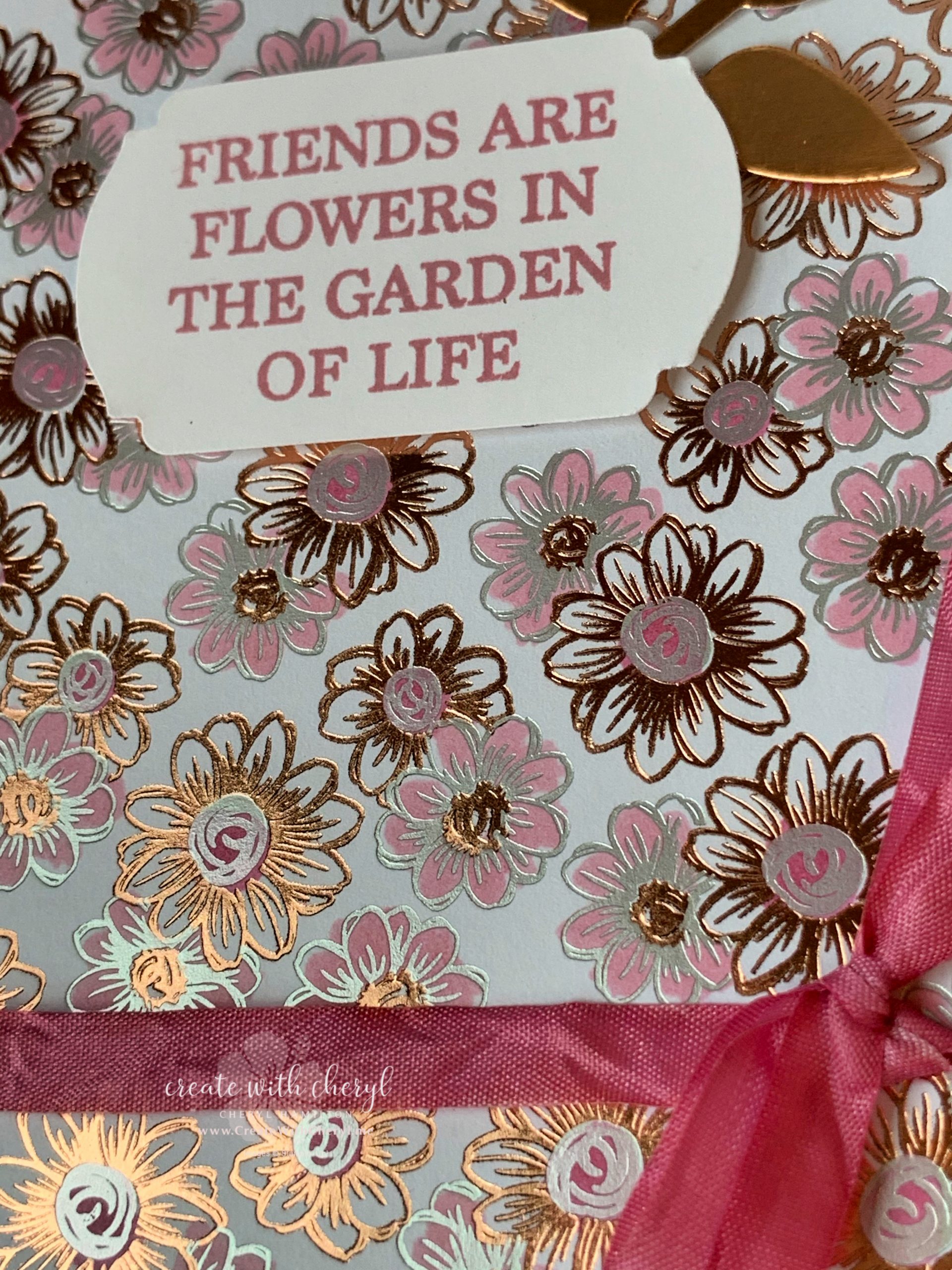 It’s really fun to color! For this card, I used my light & dark Rococo Rose Stampin’ Blends (also FREE with a $50 order!) to color the card and also to color the ribbon!