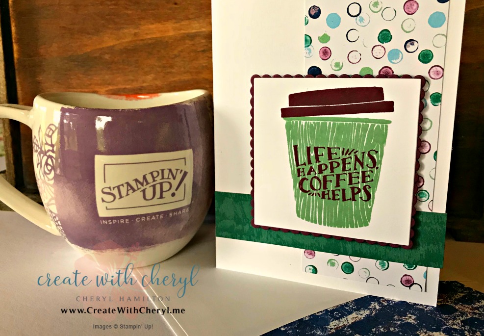Love the colors in this Designer Series Paper (DSP)! I know you want that cup!! I got that from Stampin’ Up! at one of their dinners for Silver Elite & above. They really spoil us rotten 🙂