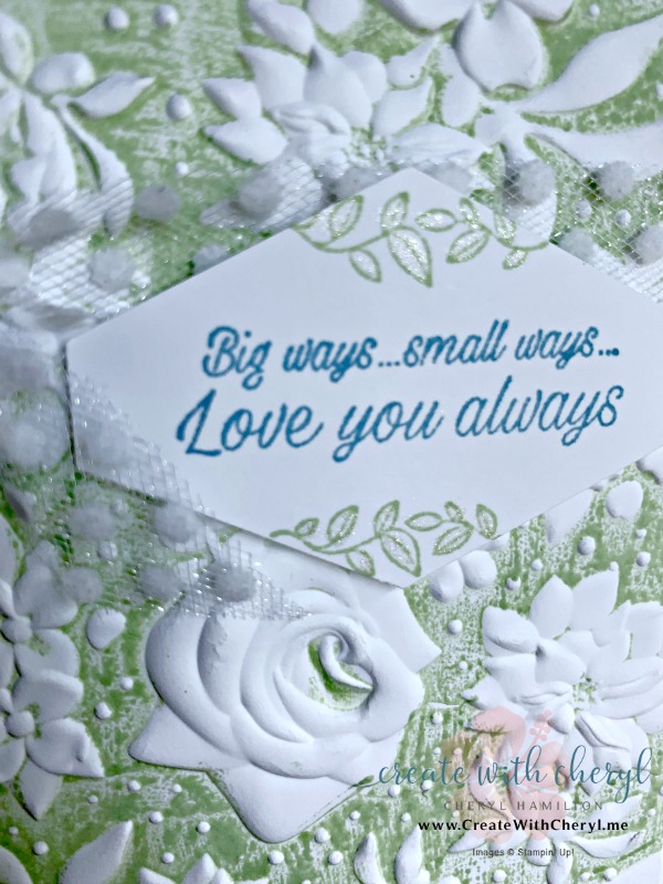 To achieve this effect, I took the Country Floral 3D Folder and inked up the side where the flowers are INDENTED, not RAISED. Then just run it through the Big Shot. Simple & pretty!