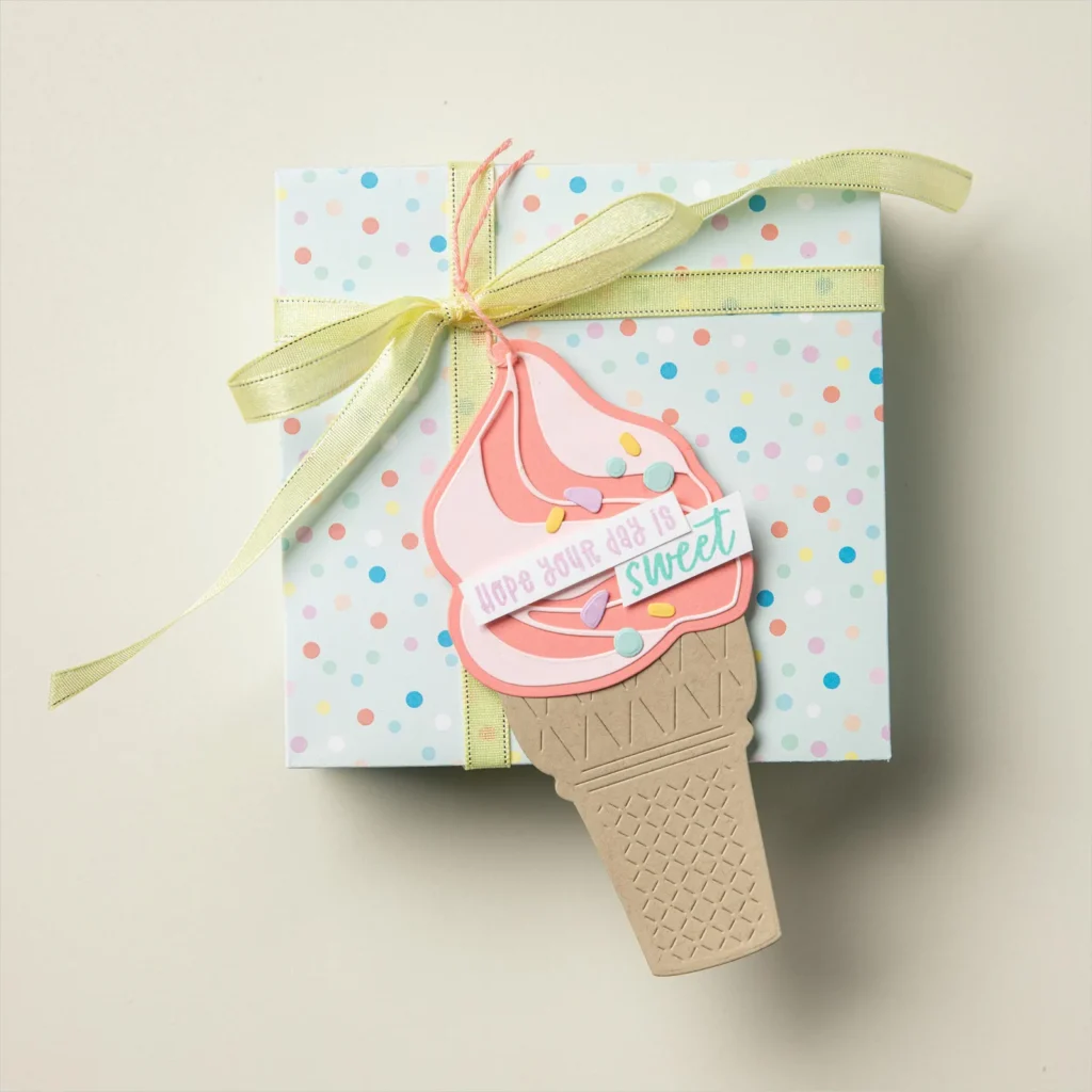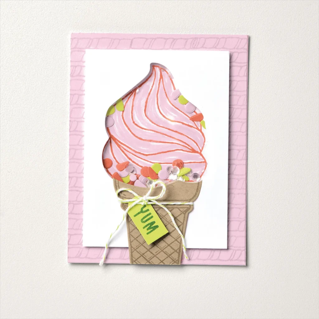 Create your own ice cream treats that look good enough to eat with the Ice Cream Swirl Stamp Set. Pair the ice cream top with the cone, or mask off the bottom of the cone to create an ice cream sundae in a bowl, then stamp the cherry on top. Or cut out the finished ice cream cone for a card or tag in a fun shape! Use different colors to change up the ice cream “flavor,” then add a playful sentiment.
