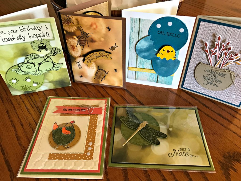 I have a very creative & fun team & we love getting together to stamp & share ideas! I wish I would have taken a photo of the inside of Helen’s card…a huge bug-eating spider! Beth should get extra credit because it looks like she’s the only one to use her paper clip!