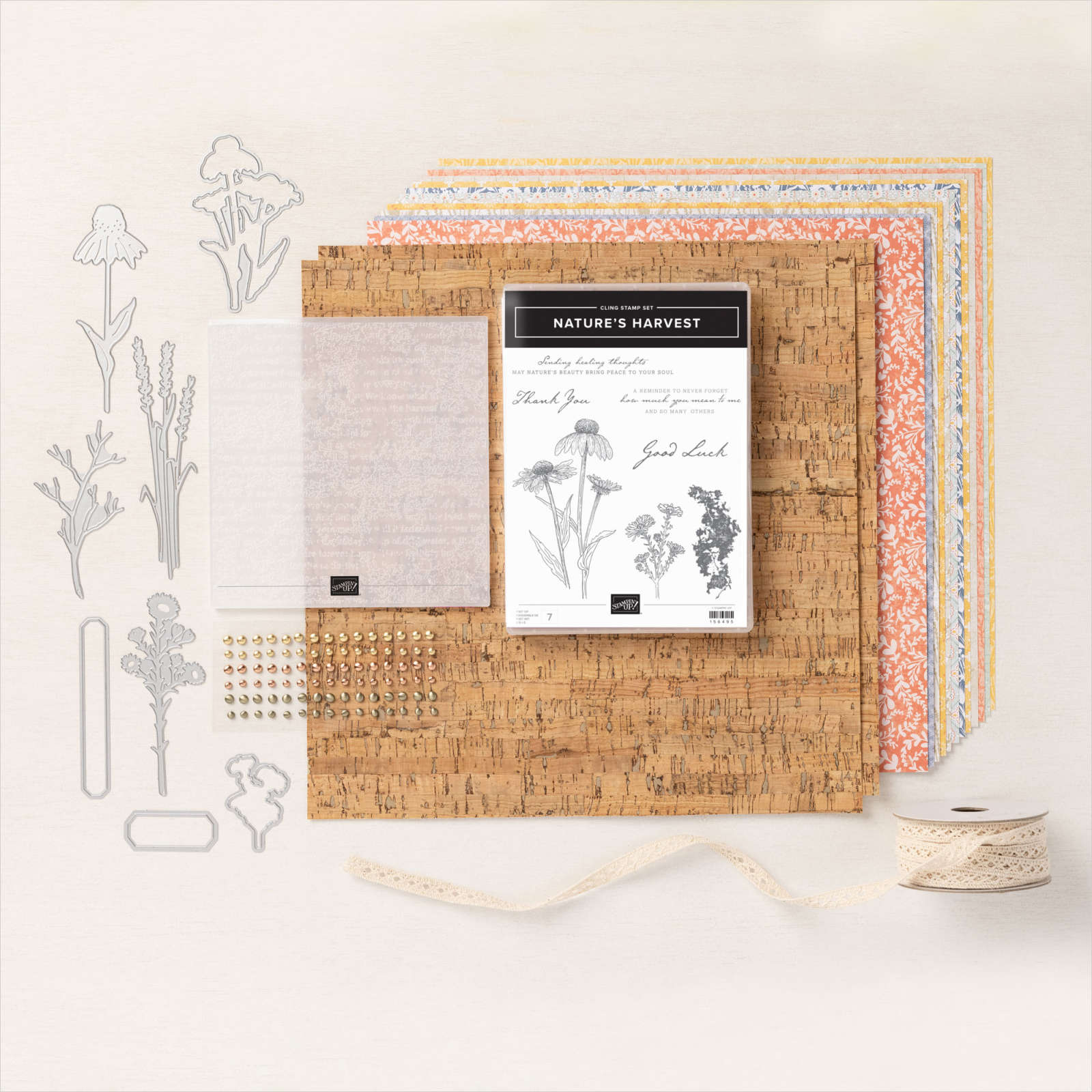Today I’m excited to show you one of the projects we made at our Island Style Stampers Beach Retreat a couple of weeks ago- a Nature’s Harvest Stand Up Card. This project was CASED from the Holiday Mini Catalog and got all of us hooked on the Cork Specialty Paper!!