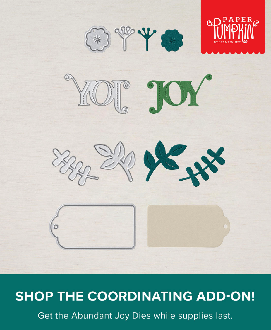 You’ll want to purchase this add-on: Abundant Joy Dies. These dies coordinate with the October, November, & December Paper Pumpkins and they’re only $12. (#166277)