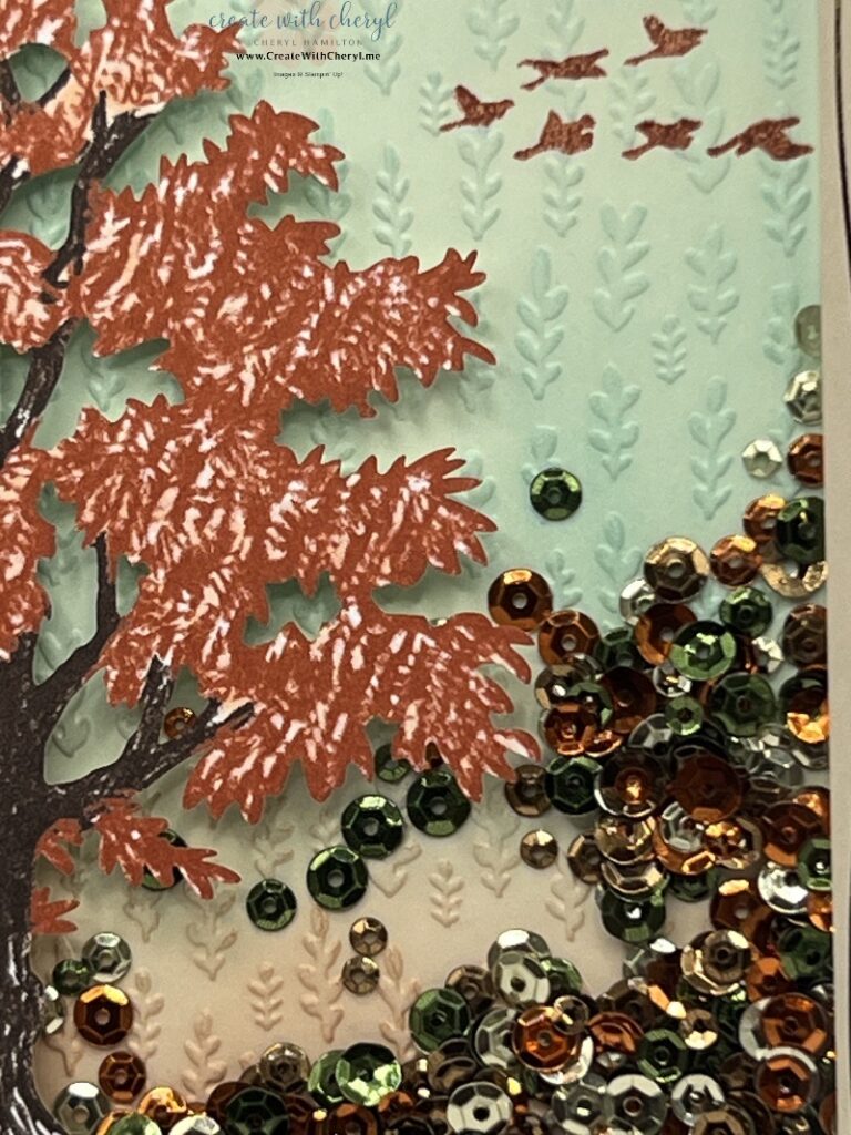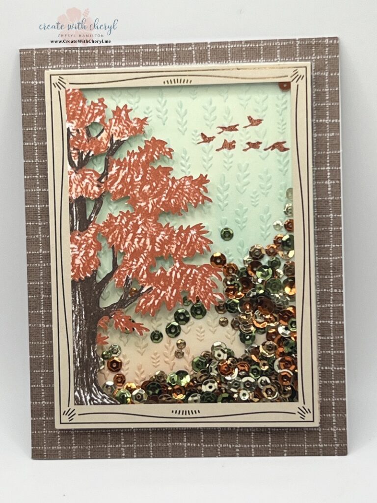 Next I thought it would be fun to make a Shaker Card! I’ve embossed the background with Gathering Leaves Embossing Folder, then added a little color using Blending Brushes. Follow along with the video and give it a try!